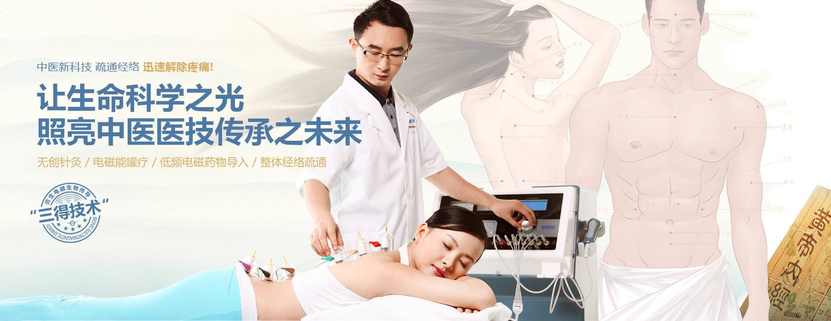 三得技術是一項基于低頻電磁能的全科高效臨床應用新技術,其四大首創(chuàng)技術分別是:“無創(chuàng)針灸”、“電磁能診療罐”、“彈道式電磁止痛沖擊槍”、“電磁能藥物導入”。